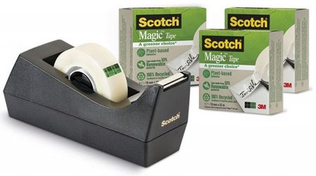 opakowanie zawiera 3 rolki taśmy Scotch® Magic™ Greener Choice, w rozmiarze 19mm x 33m i podajnik Scotch® C-38